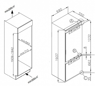 холодильник-морозильник встраиваемый, 341 л, класс энергопотребления А+, No Frost, 69х55х193,7 cм