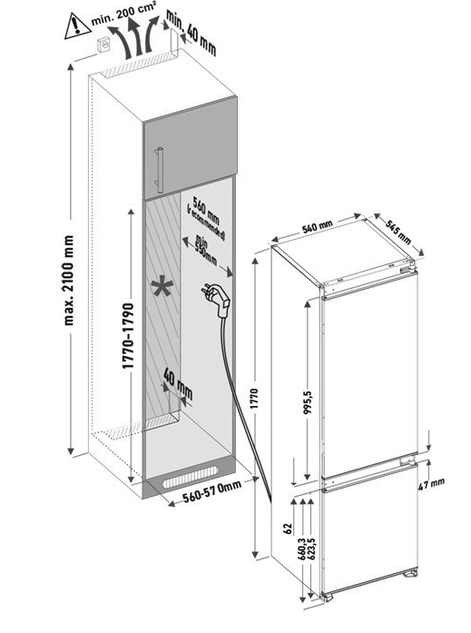 холодильник-морозильник встраиваемый, 243 л, класс энергопотребления А+, No Frost, 54х54,5х177 см
