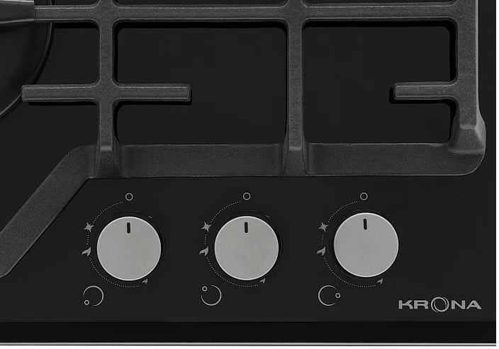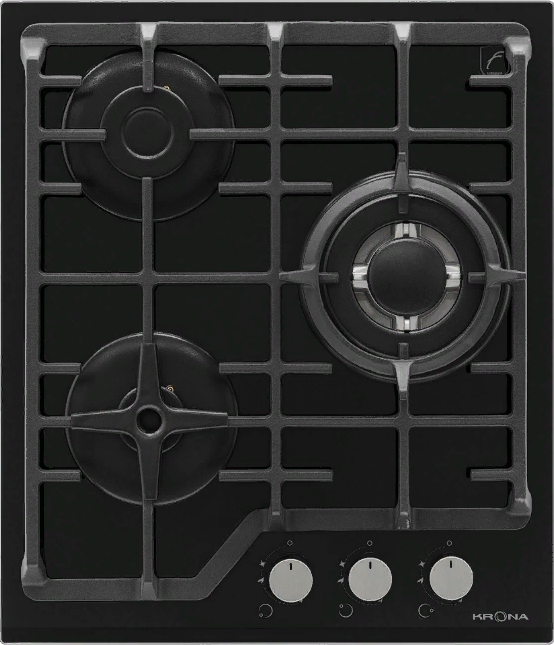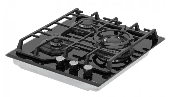 поверхность газовая, 45 см, газ на стекле, 3 конфорки, решетки чугунные, черный