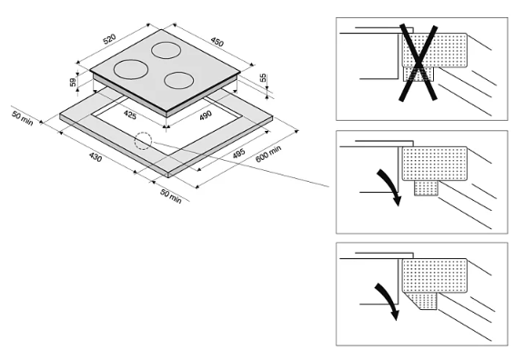 Расположение панели управления варочной поверхностью относительно конфорок. Если панель расположена сбоку, она будет справа.