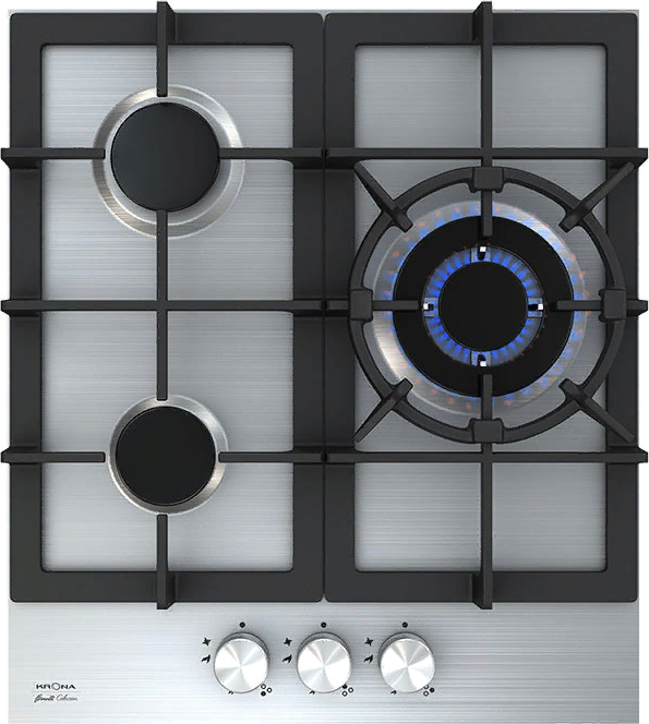 поверхность газовая, 45 см, газ на металле, 3 конфорки, решетки чугунные, нержавеющая сталь