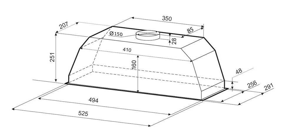 вытяжка встраиваемая в подвесной шкаф, 53 см, 600/ч, нержавеющая сталь