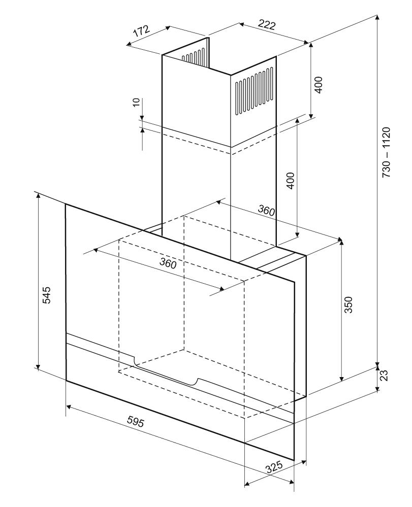 вытяжка наклонная, 60 см, 1000 м3/ч, черное стекло + нержавеющая сталь