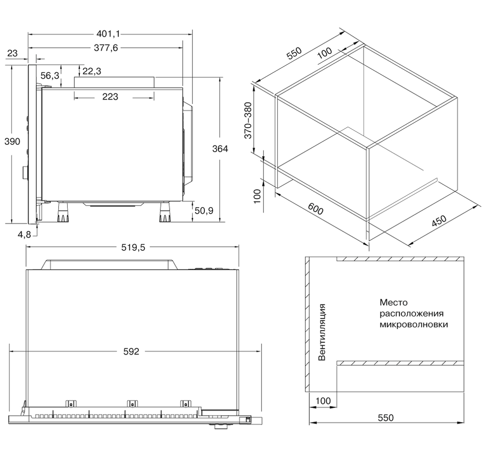 микроволновая печь встраиваемая, 31 л, 59,2х40,1х39 см, черный