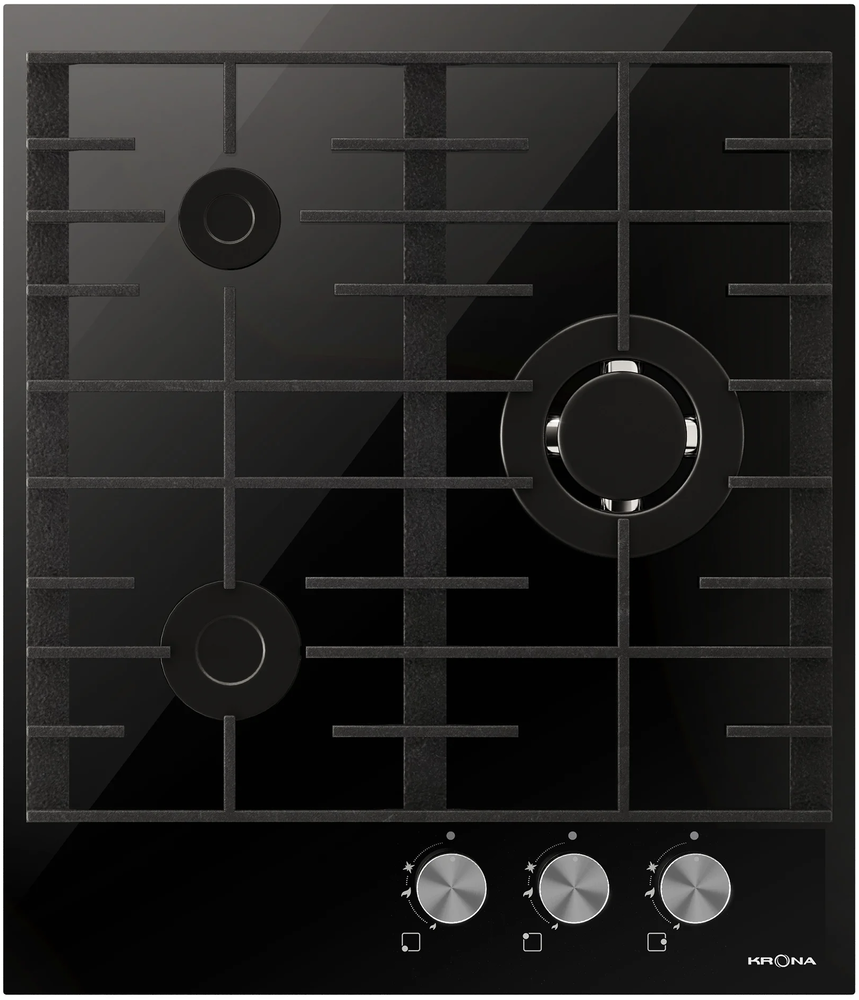 поверхность газовая, 45 см, газ на стекле, 3 конфорки, решетки чугунные, черный