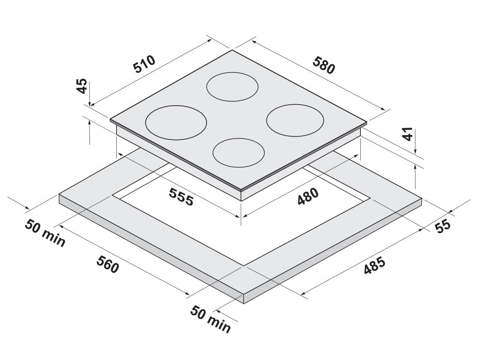 Характер огранки фаски на внешней стороне варочной панели. Металлические рамки предотвращают забивание монтажных швов крошками и пылью.