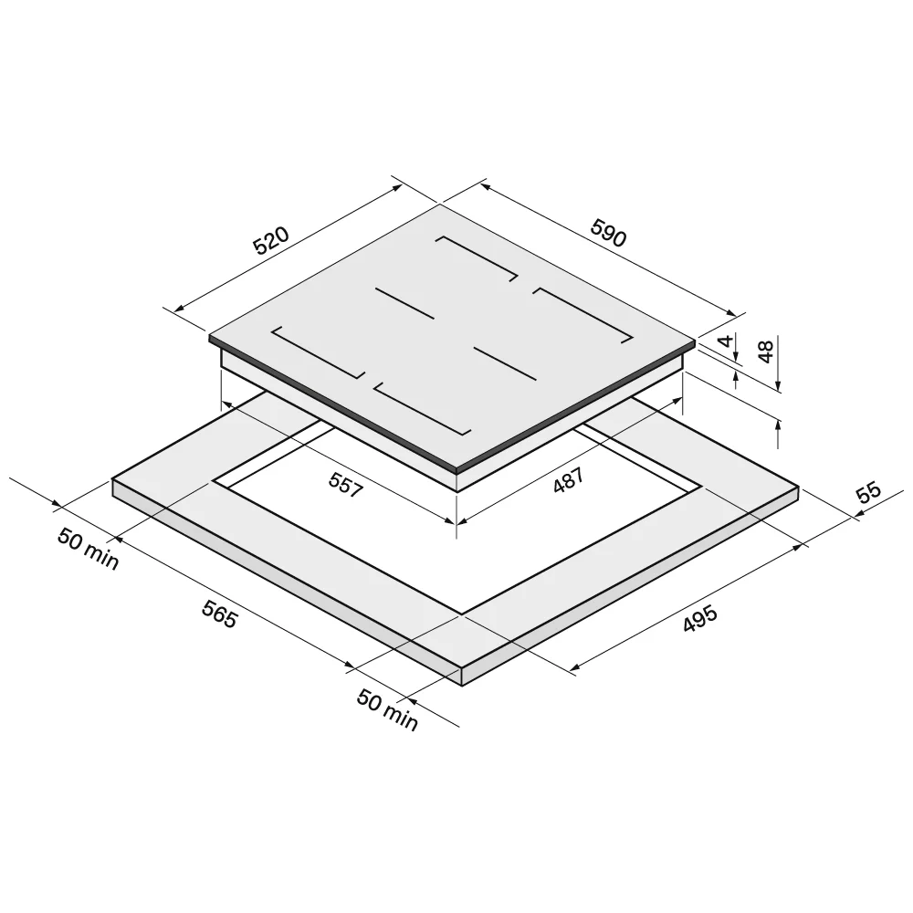 Характер огранки фаски на внешней стороне варочной панели. Металлические рамки предотвращают забивание монтажных швов крошками и пылью.