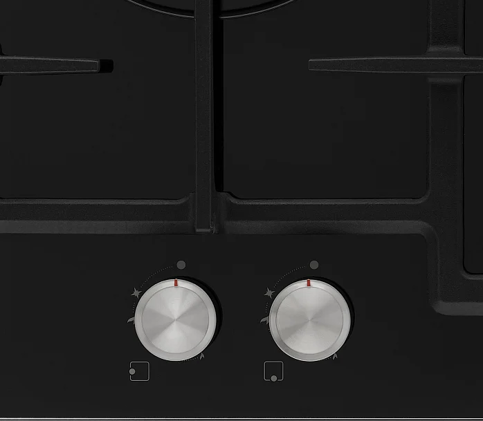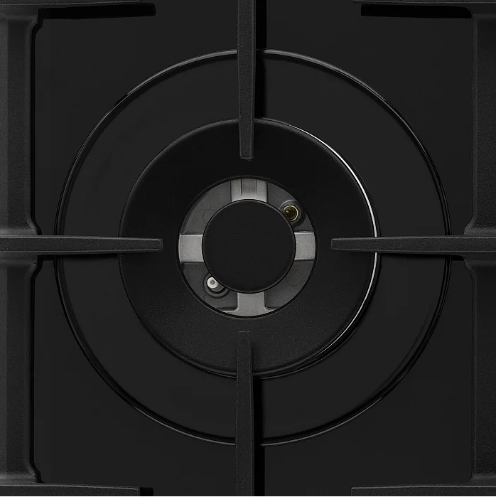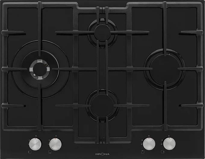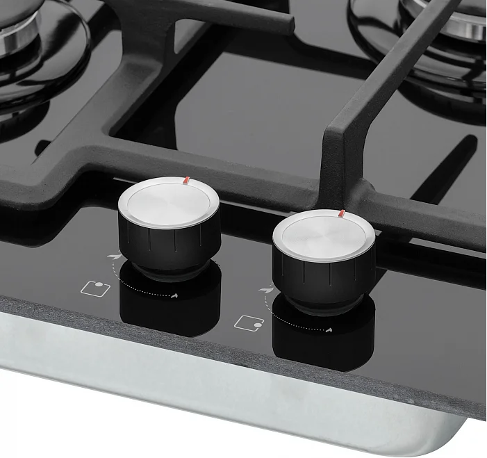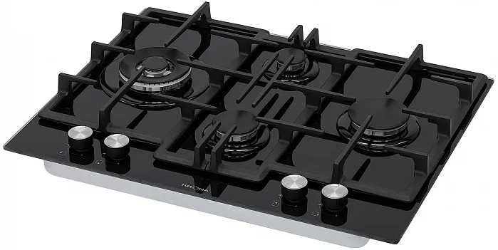 поверхность газовая, 67 см, газ на стекле, 4 конфорки, решетки чугунные, черный