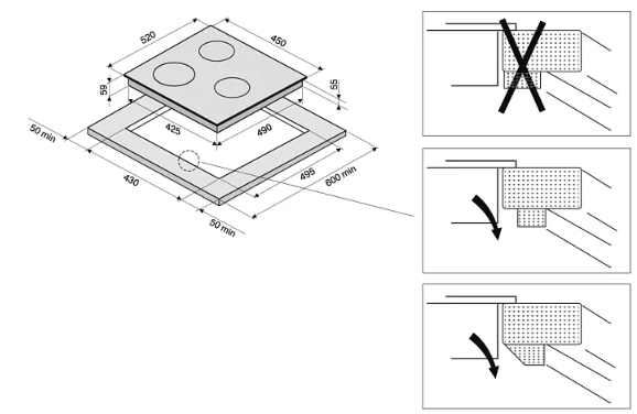 Расположение панели управления варочной поверхностью относительно конфорок. Если панель расположена сбоку, она будет справа.