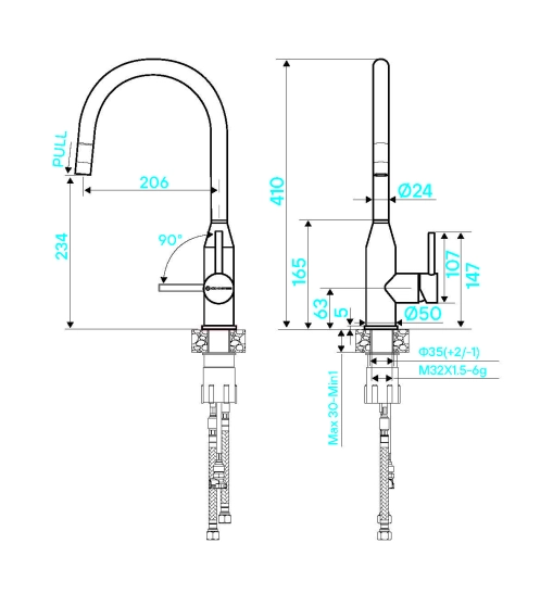 смеситель для кухни, нержавеющая сталь, высокий поворотный выдвижной излив, нержавеющая сталь