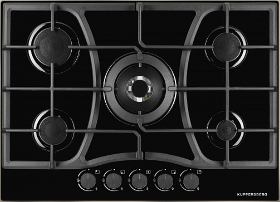 поверхность газовая, 70 см, газ на стекле, 5 конфорок, решетки чугунные, черный