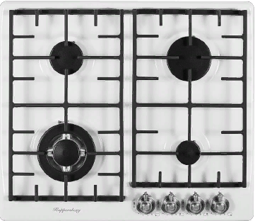 поверхность газовая, 60 см, газ на эмали, 4 конфорки, чугунные решетки, белый/ручки цвета серебро