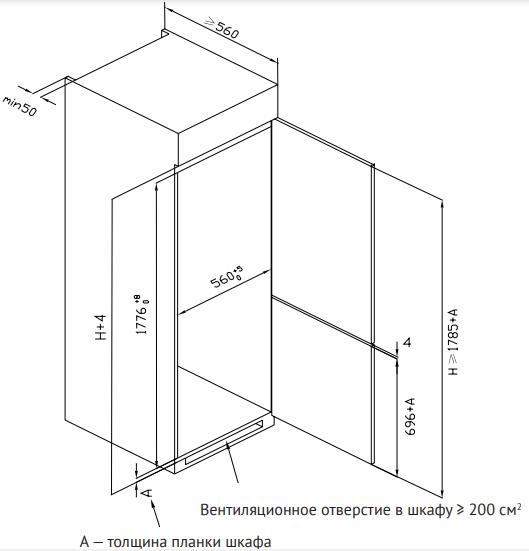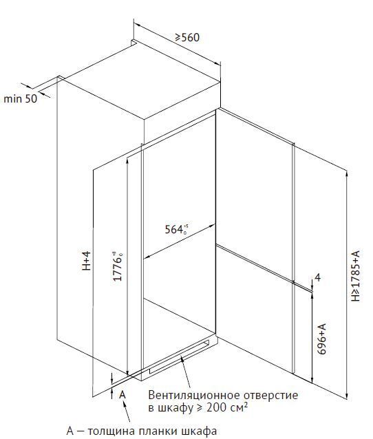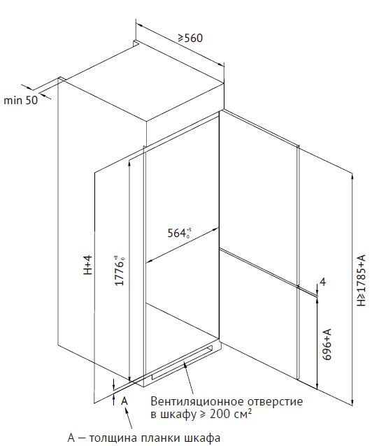 холодильник-морозильник встраиваемый, 241 л, класс энергопотребления А+, No Frost, 54х54,5х177 см