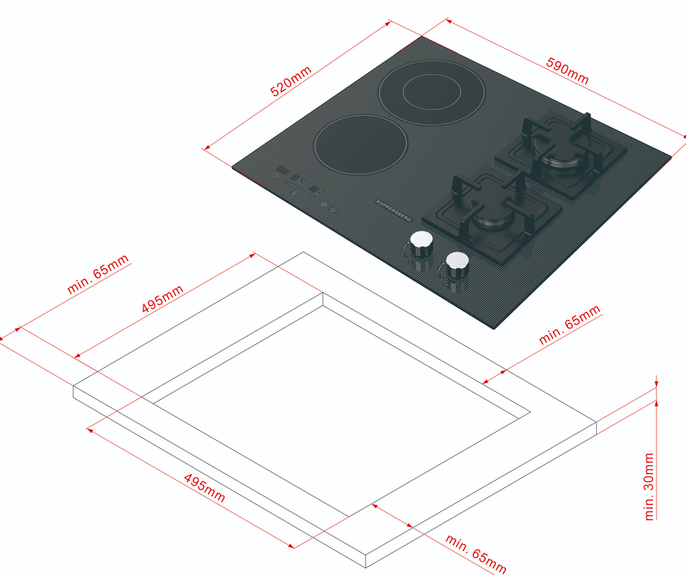 Характер огранки фаски на внешней стороне варочной панели. Металлические рамки предотвращают забивание монтажных швов крошками и пылью.