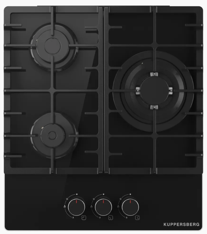 поверхность газовая, 45 см, газ на стекле, 3 конфорки, решетки чугунные, черный