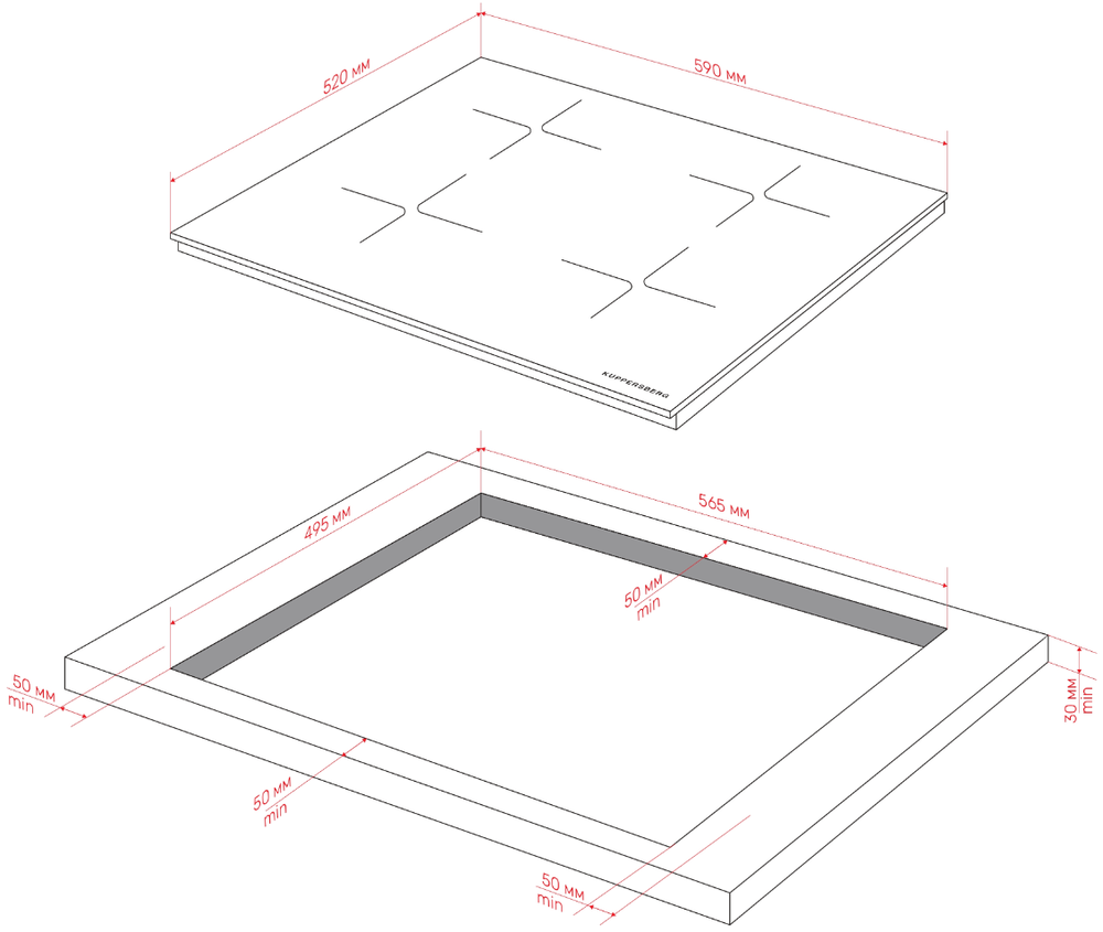 Характер огранки фаски на внешней стороне варочной панели. Металлические рамки предотвращают забивание монтажных швов крошками и пылью.