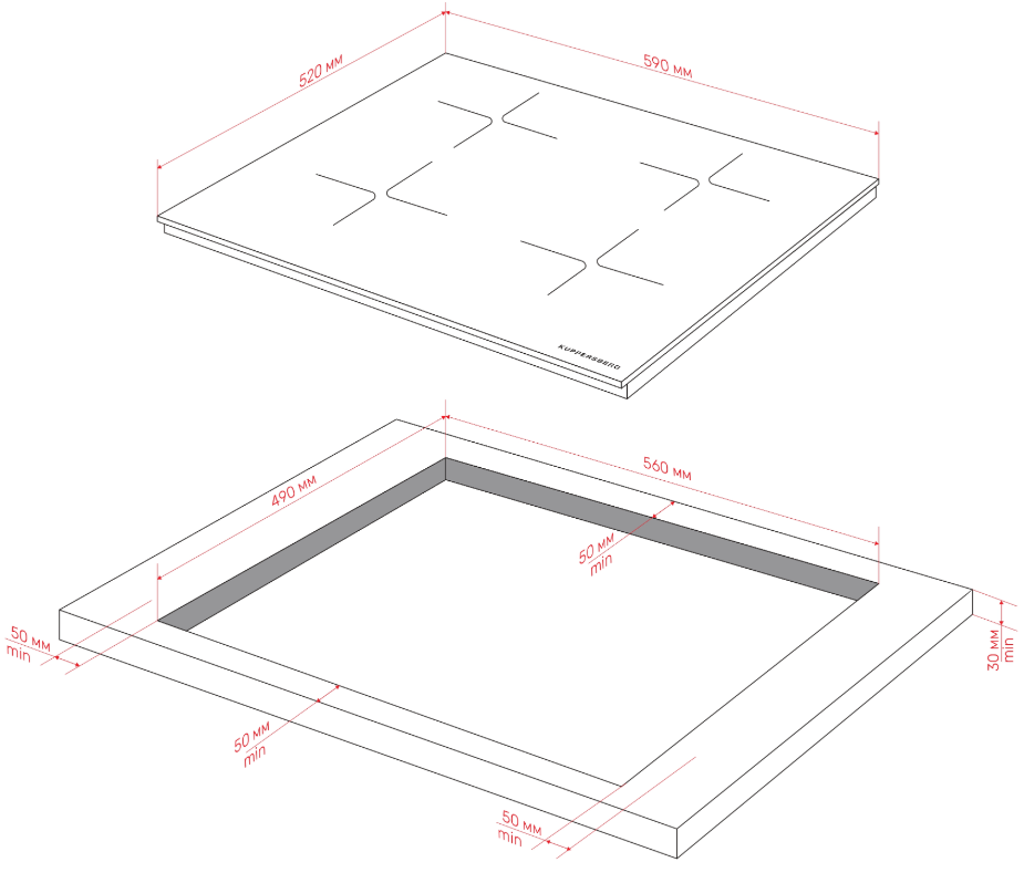 Характер огранки фаски на внешней стороне варочной панели. Металлические рамки предотвращают забивание монтажных швов крошками и пылью.