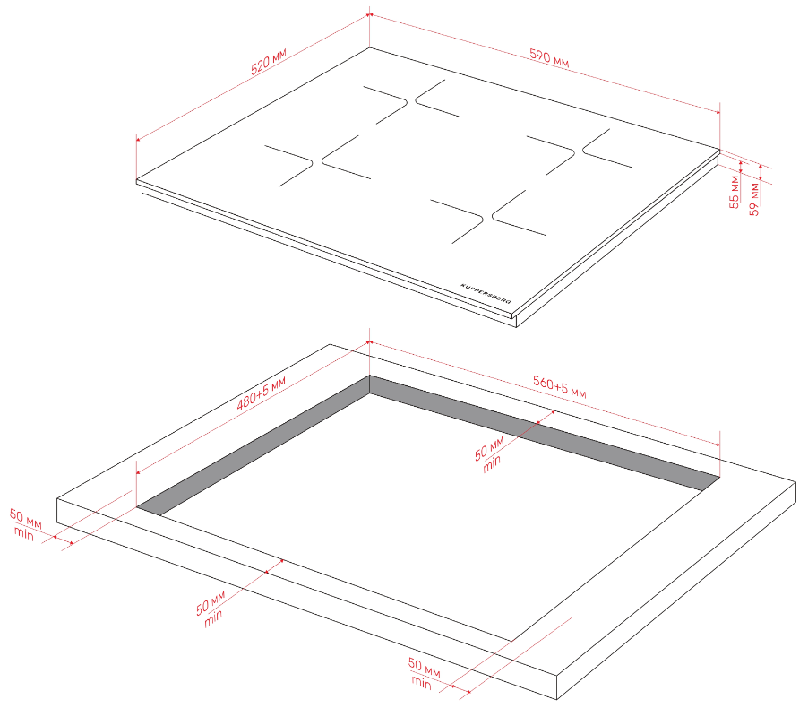 Характер огранки фаски на внешней стороне варочной панели. Металлические рамки предотвращают забивание монтажных швов крошками и пылью.