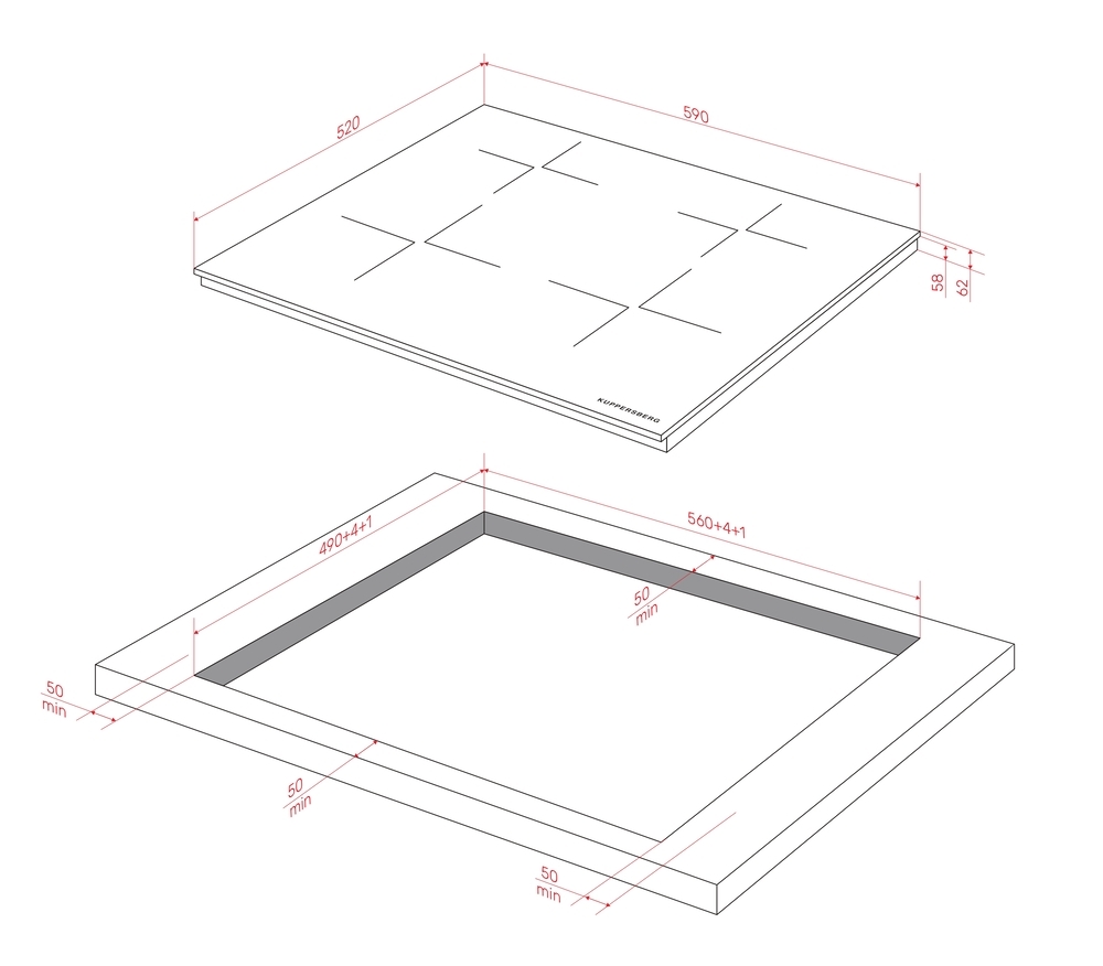 Характер огранки фаски на внешней стороне варочной панели. Металлические рамки предотвращают забивание монтажных швов крошками и пылью.