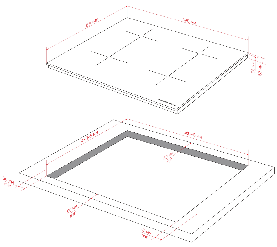 Характер огранки фаски на внешней стороне варочной панели. Металлические рамки предотвращают забивание монтажных швов крошками и пылью.