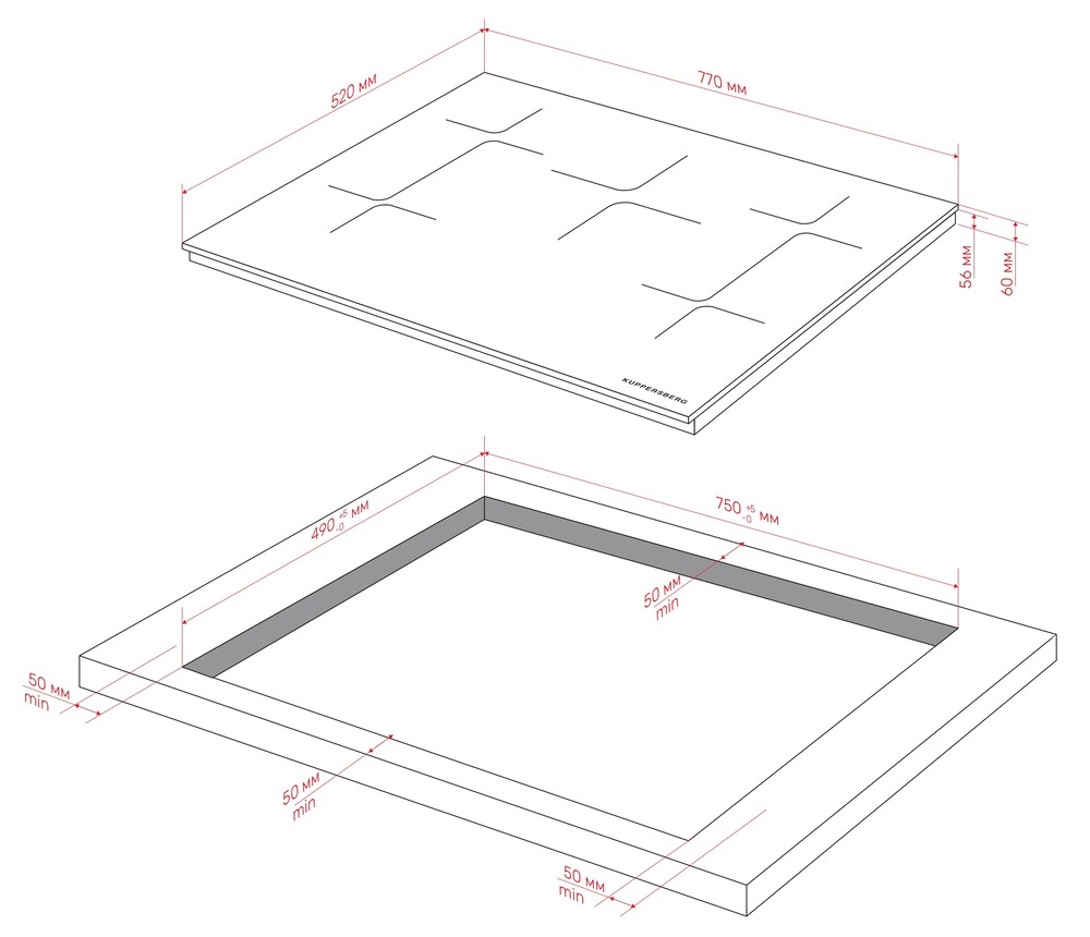 Характер огранки фаски на внешней стороне варочной панели. Металлические рамки предотвращают забивание монтажных швов крошками и пылью.