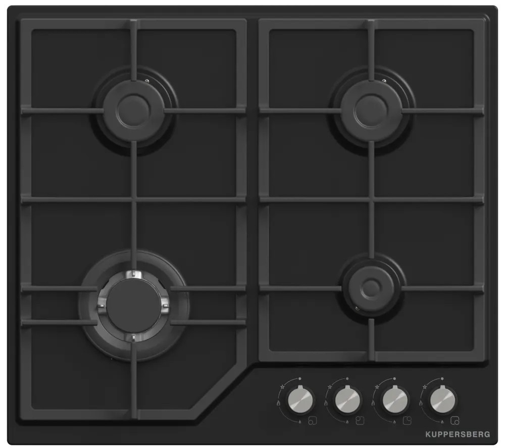 поверхность газовая, 60 см, газ на стекле, 4 конфорки, решетки чугунные, черный