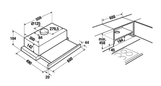вытяжка встраиваемая телескопическая, 60 см, 385 м3/ч, нержавеющая сталь