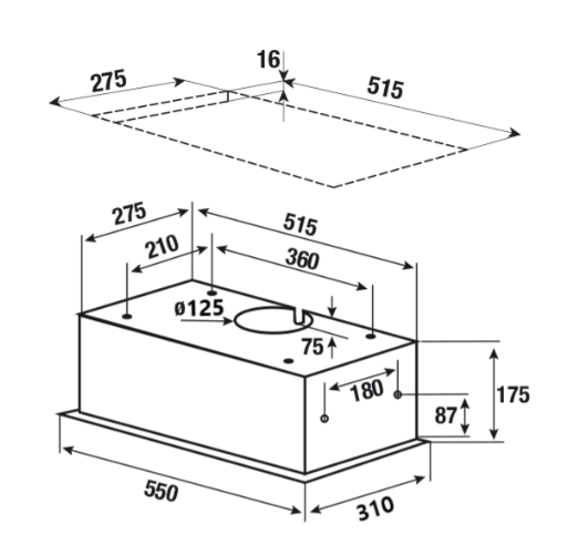 вытяжка встраиваемая в подвесной шкаф, 55 см, 329 м3/ч, черное стекло
