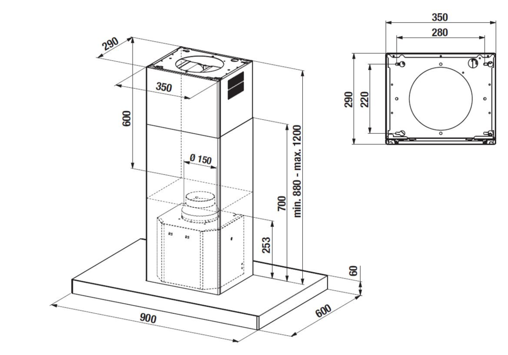 вытяжка островная, 90 см, 700м3/ч, нержавеющая сталь