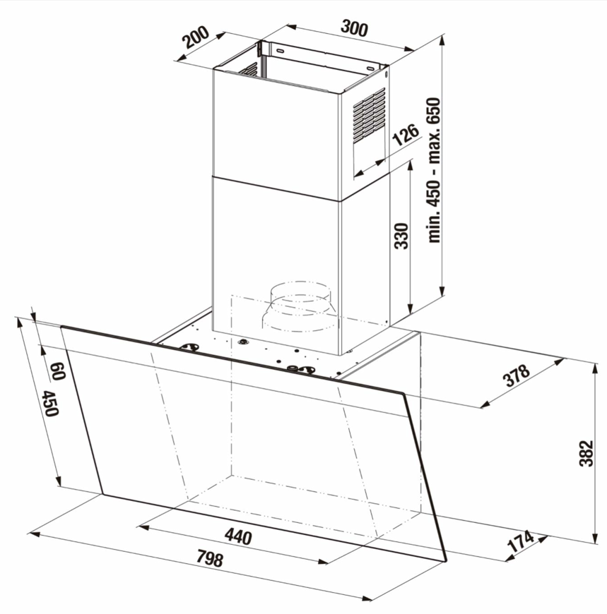 вытяжка наклонная, 80 см, 720 м3/ч, черное стекло/ нерж.сталь