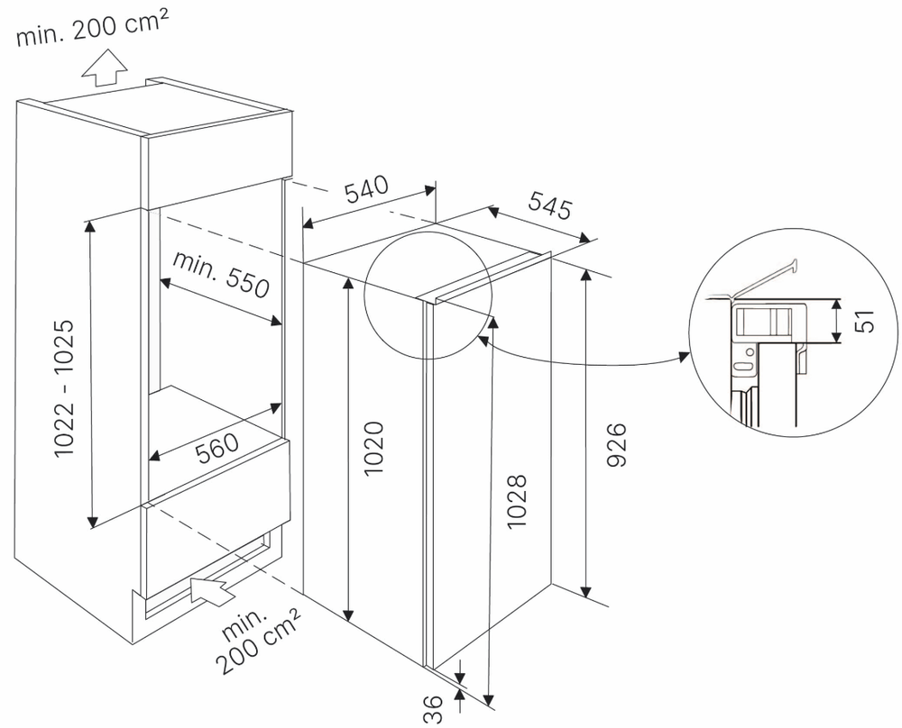 холодильник-морозильник встраиваемый, 140 л, No Frost, 54х54х102 см
