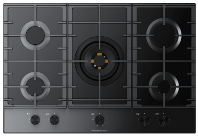 поверхность газовая, 75 см, газ на стекле, 5 конфорок, чугунная решетка, черный