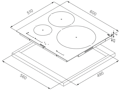 Расположение панели управления варочной поверхностью относительно конфорок. Если панель расположена сбоку, она будет справа.