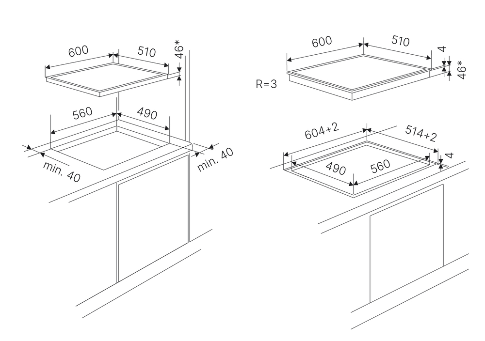 Характер огранки фаски на внешней стороне варочной панели. Металлические рамки предотвращают забивание монтажных швов крошками и пылью.