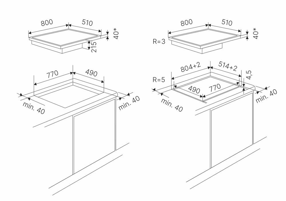 Характер огранки фаски на внешней стороне варочной панели. Металлические рамки предотвращают забивание монтажных швов крошками и пылью.