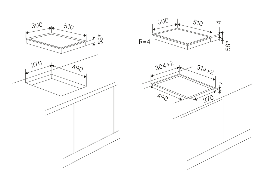 Характер огранки фаски на внешней стороне варочной панели. Металлические рамки предотвращают забивание монтажных швов крошками и пылью.