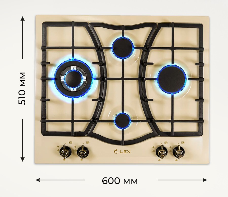 поверхность газовая, 60 см, газ на эмали, 4 конфорки, решетки чугунные, слоновая кость/латунь