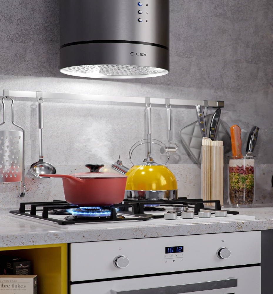 Модели со встроенной вытяжкой подходят для компактных кухонь. Запахи, пар и дым от готовки полностью поглощаются встроенной вытяжкой.