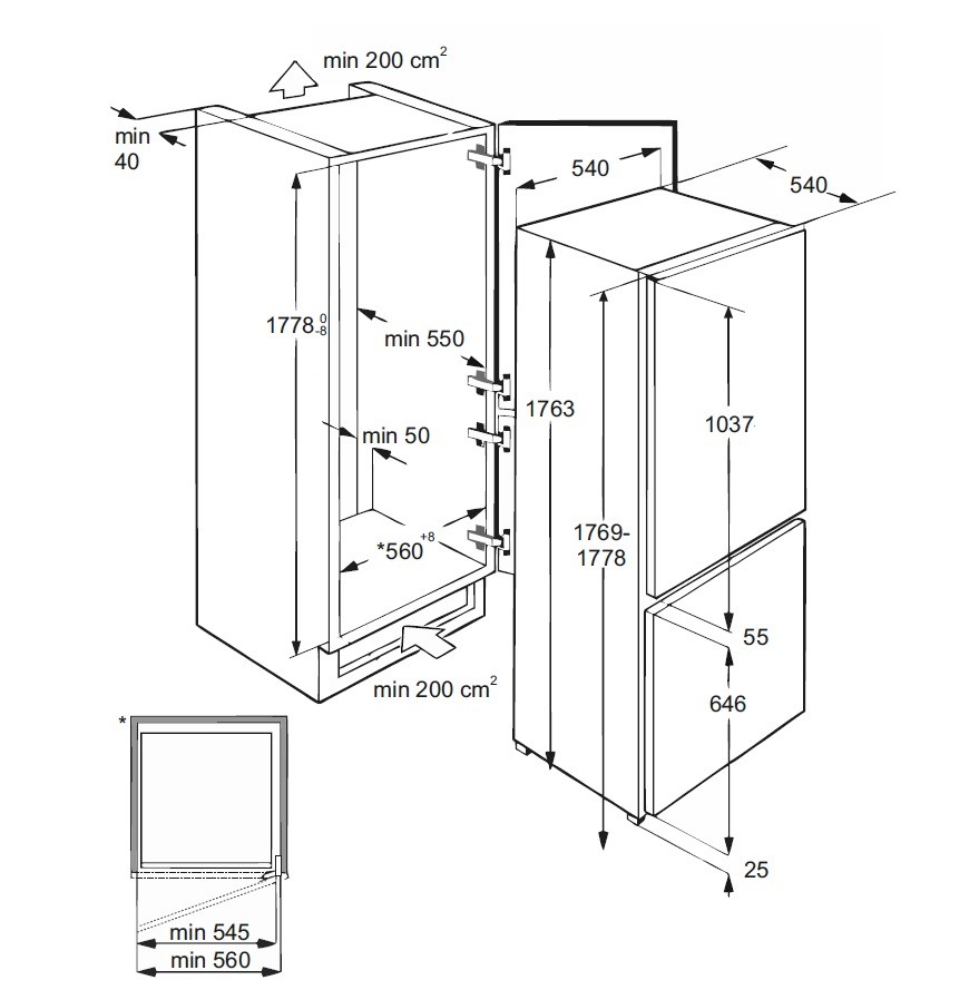 холодильник-морозильник встраиваемый, 250 л, класс энергопотребления А+, ручное размораживание, 54x54x177 см