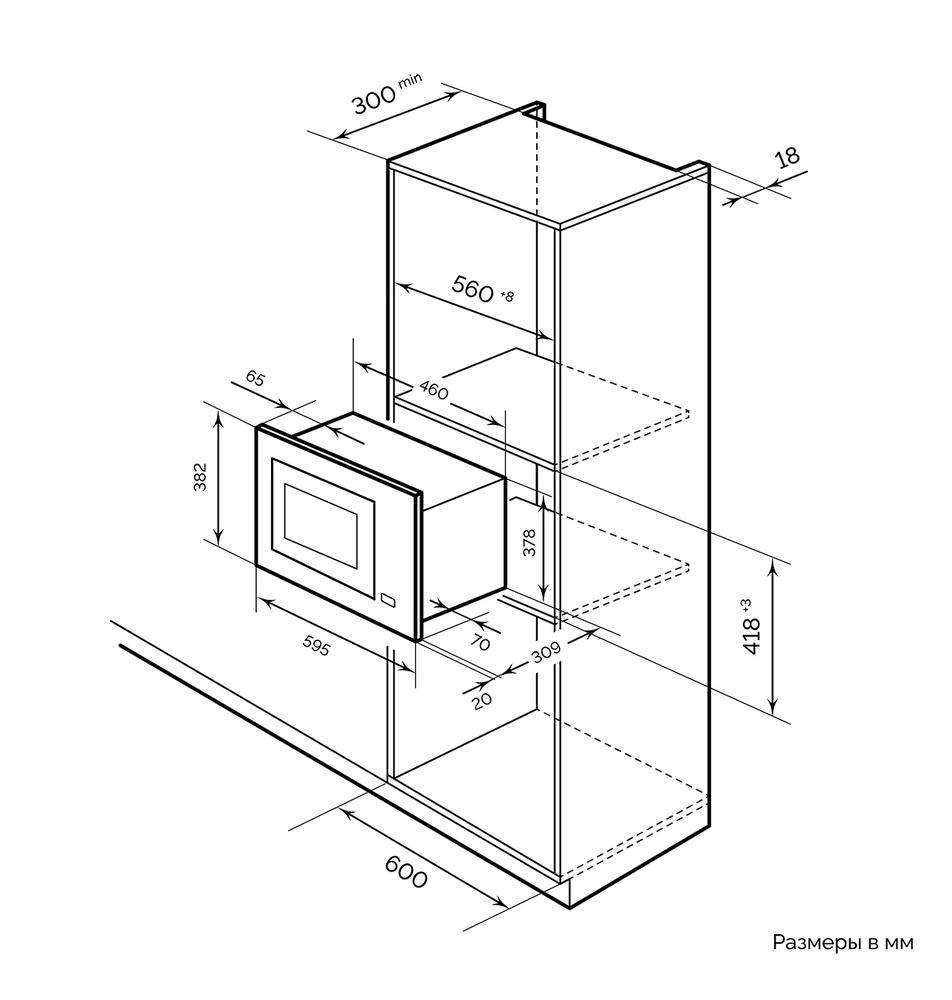 микроволновая печь встраиваемая, 20 л, 59,5х31,6х38,2 см, нержавеющая сталь