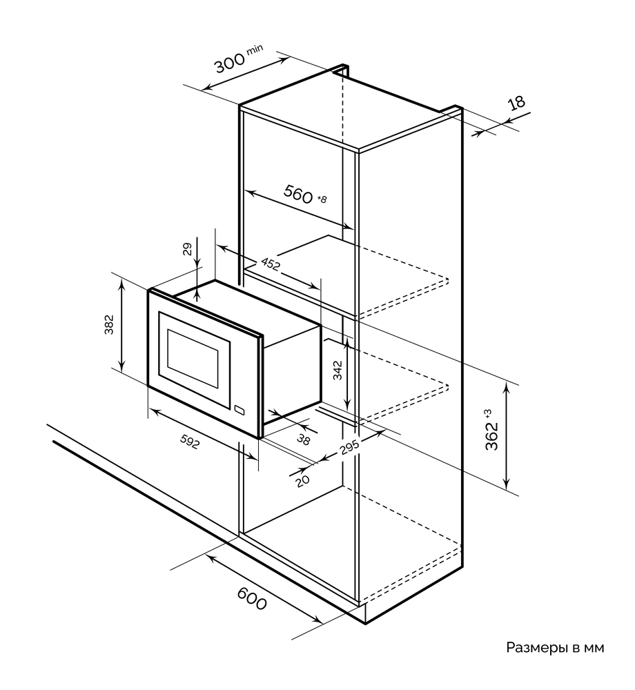 микроволновая печь встраиваемая, 20 л, 59,5х32,9х38,2 см, нержавеющая сталь