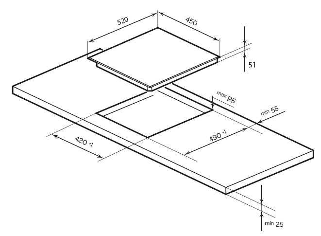 Характер огранки фаски на внешней стороне варочной панели. Металлические рамки предотвращают забивание монтажных швов крошками и пылью.