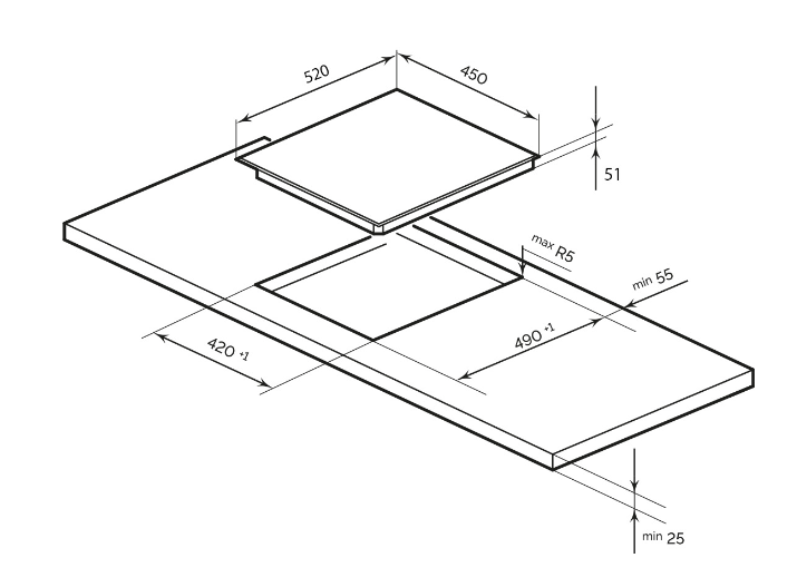 Характер огранки фаски на внешней стороне варочной панели. Металлические рамки предотвращают забивание монтажных швов крошками и пылью.