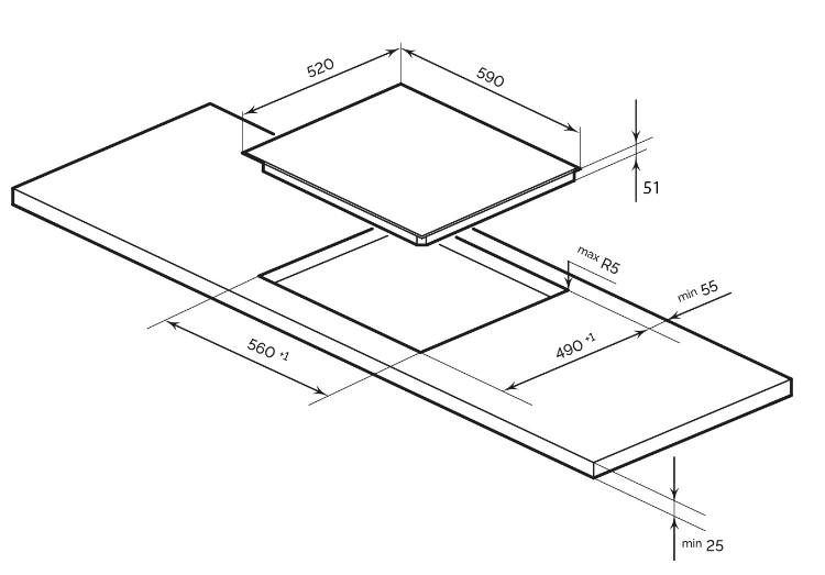 Характер огранки фаски на внешней стороне варочной панели. Металлические рамки предотвращают забивание монтажных швов крошками и пылью.