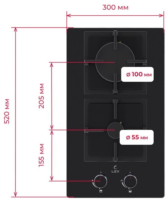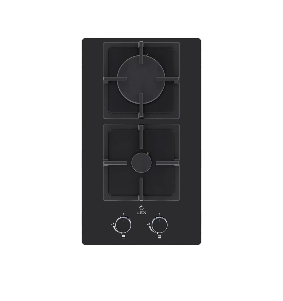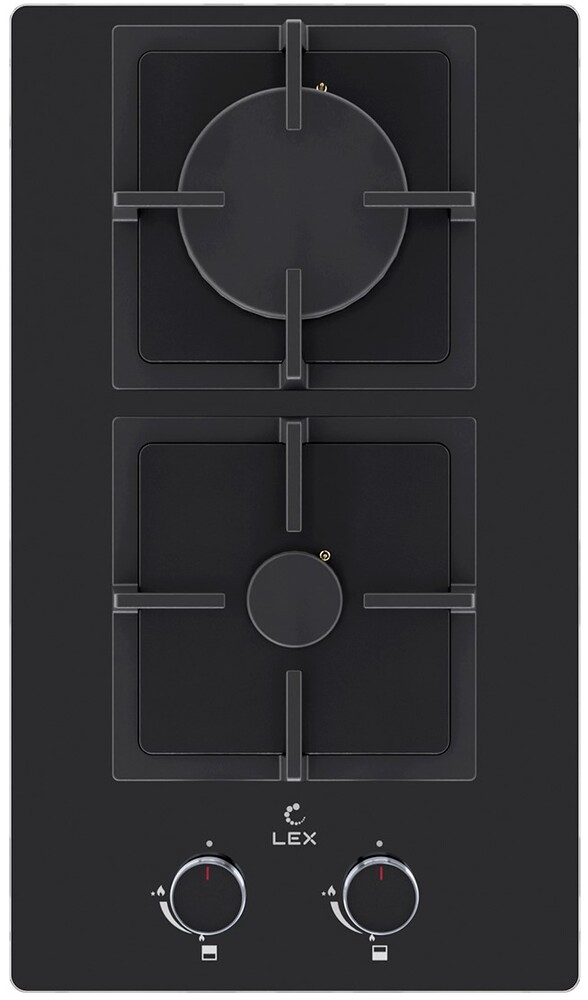 поверхность газовая, 30 см, газ на стекле, 2 конфорки, чугунные решетки, черный