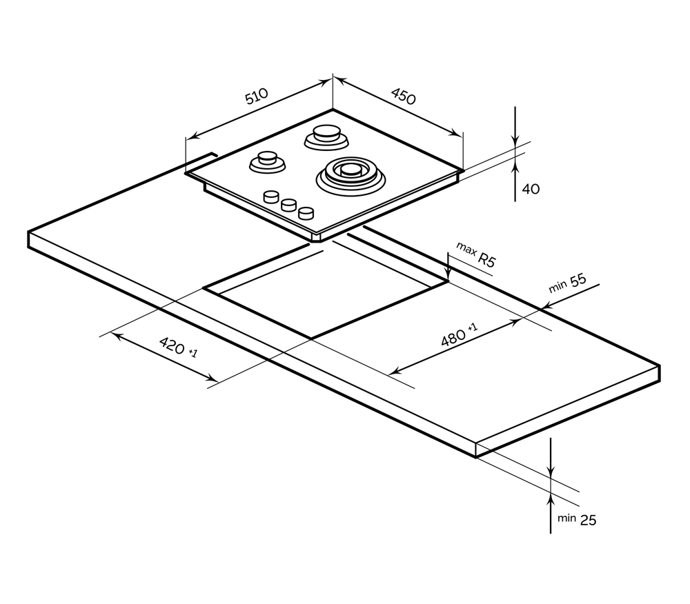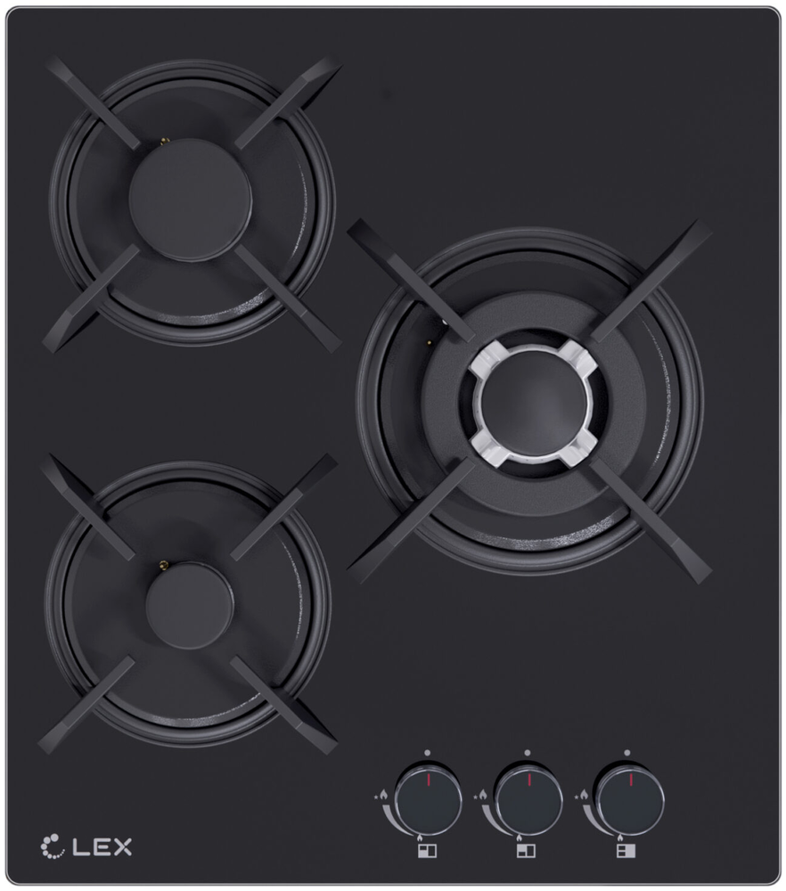 поверхность газовая, 45 см, газ на стекле, 3 конфорки, решетки чугунные, черный