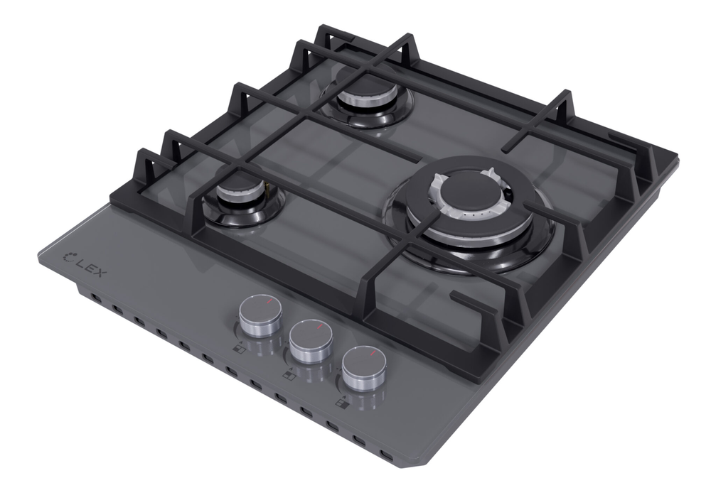 поверхность газовая, 45 см, газ на стекле, 3 конфорки, решетки чугунные, серый