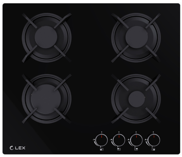 поверхность газовая, 60 см, газ на стекле, 4 конфорки, решетки чугунные, черный