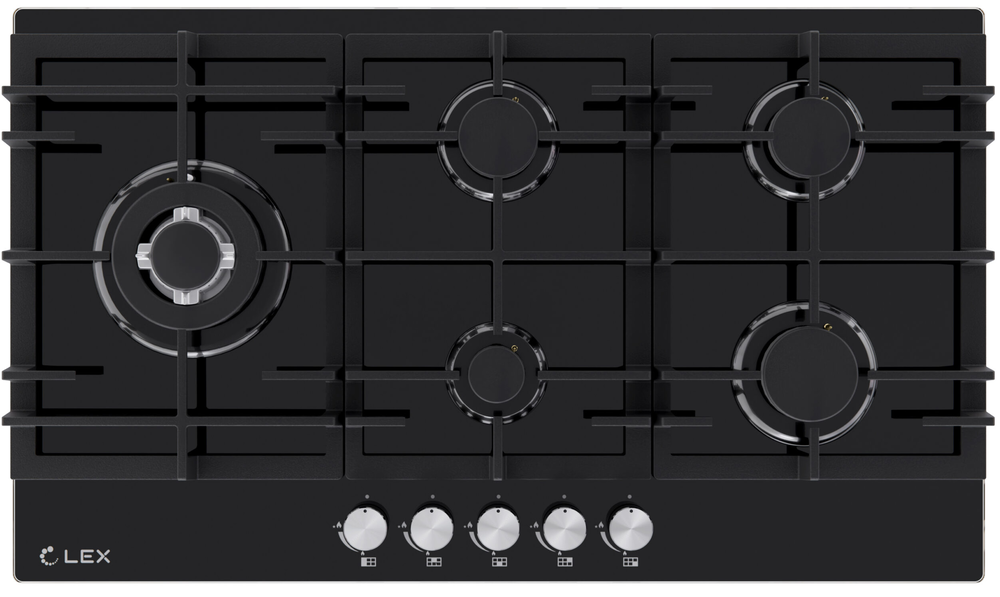 поверхность газовая, 86 см, газ на стекле, 5 конфорок, решетки чугунные, черный