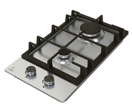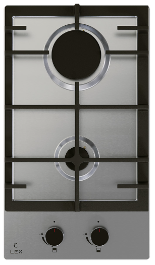 поверхность газовая, 30 см, газ на металле, 2 конфорки, решетки чугунные, нержавеющая сталь